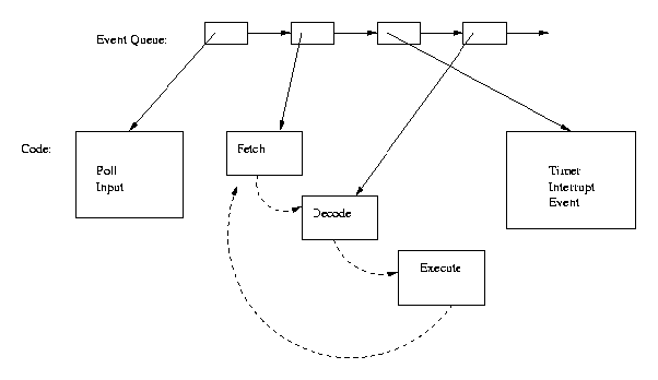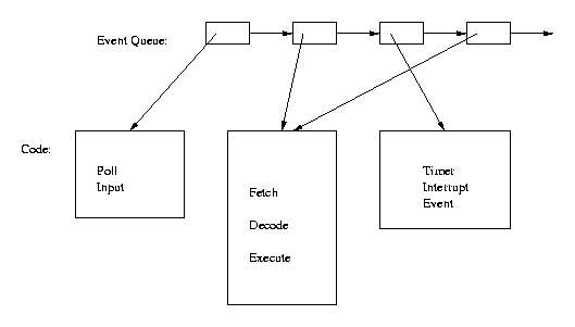 Finally, notice that when "Fetch/Decode/Execute" was one large function, information could be passed from one part to another by local variables in that function. When each is a separate event, however, there is no direct internal communication between them. Information can only be passed from "Fetch" to "Decode", for example, by (a) putting it in a global variable to which both have access, or (b) putting it in the local data structure which is associated with the event. When "Fetch" schedules "Decode" as the next event in its event stream, it will specify the three parameters to the basic event system: