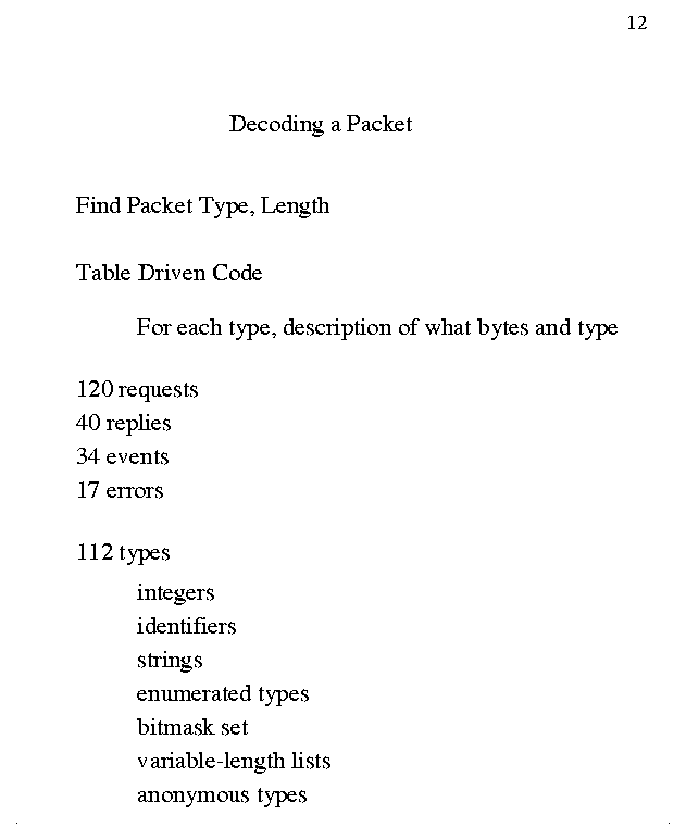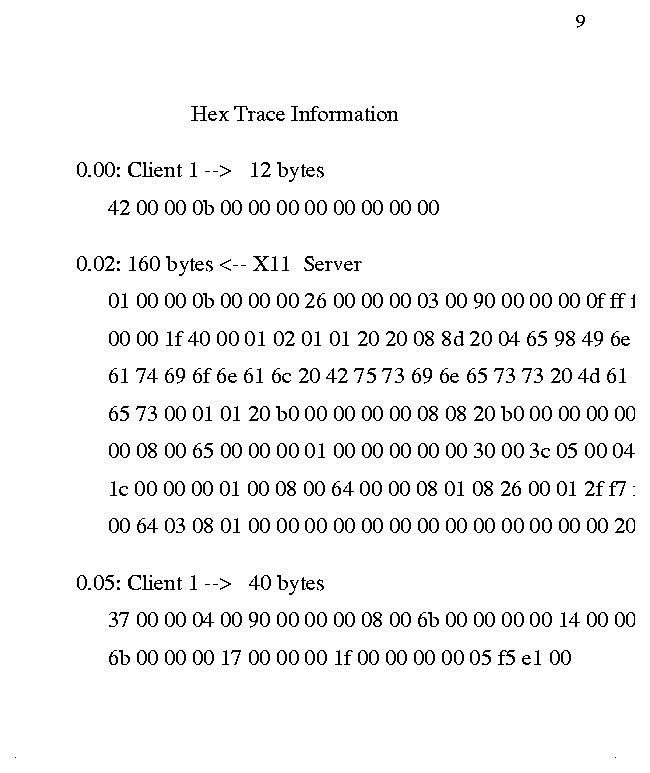 16 0.00: Client 1 --> 12 bytes 0.01: 160 bytes <-- X11 Server 1 0.02: Client 1 --> 40 bytes ............REQUEST: CreateGC ............REQUEST: GetProperty 0.03: 32 bytes <-- X11 Server 1 ..............REPLY: GetProperty 0.04: Client 1 --> 196 bytes ............REQUEST: CreateWindow ............REQUEST: ChangeProperty ............REQUEST: ChangeProperty ............REQUEST: ChangeProperty ............REQUEST: CreateGC ............REQUEST: MapWindow ............REQUEST: ChangeWindowAttributes ............REQUEST: ClearArea ............REQUEST: GetWindowAttributes 0.05: 44 bytes <-- X11 Server 1 ..............REPLY: GetWindowAttributes 0.06: Client 1 --> 8 bytes ............REQUEST: GetGeometry 0.07: 32 bytes <-- X11 Server 1 ..............REPLY: GetGeometry 0.08: Client 1 --> 120 bytes ............REQUEST: ClearArea ............REQUEST: PolySegment ............REQUEST: PolySegment 0.17: 32 bytes <-- X11 Server 1 ..............EVENT: Expose 0.18: Client 1 --> 24 bytes ............REQUEST: ClearArea ............REQUEST: GetWindowAttributes 0.23: 44 bytes <-- X11 Server 1 ..............REPLY: GetWindowAttributes 0.24: Client 1 --> 8 bytes ............REQUEST: GetGeometry 0.27: 32 bytes <-- X11 Server 1 ..............REPLY: GetGeometry 0.28: Client 1 --> 120 bytes ............REQUEST: ClearArea ............REQUEST: PolySegment ............REQUEST: PolySegment 1.29: 32 bytes <-- X11 Server 1 ..............EVENT: KeyPress 1.30: Client 1 --> 8 bytes ............REQUEST: GetKeyboardMapping 1.32: 1104 bytes <-- X11 Server 1 ..............REPLY: GetKeyboardMapping 1.33: Client 1 --> 4 bytes ............REQUEST: GetModifierMapping 1.34: 48 bytes <-- X11 Server 1 ..............REPLY: GetModifierMapping 1.35: Client 1 --> EOF