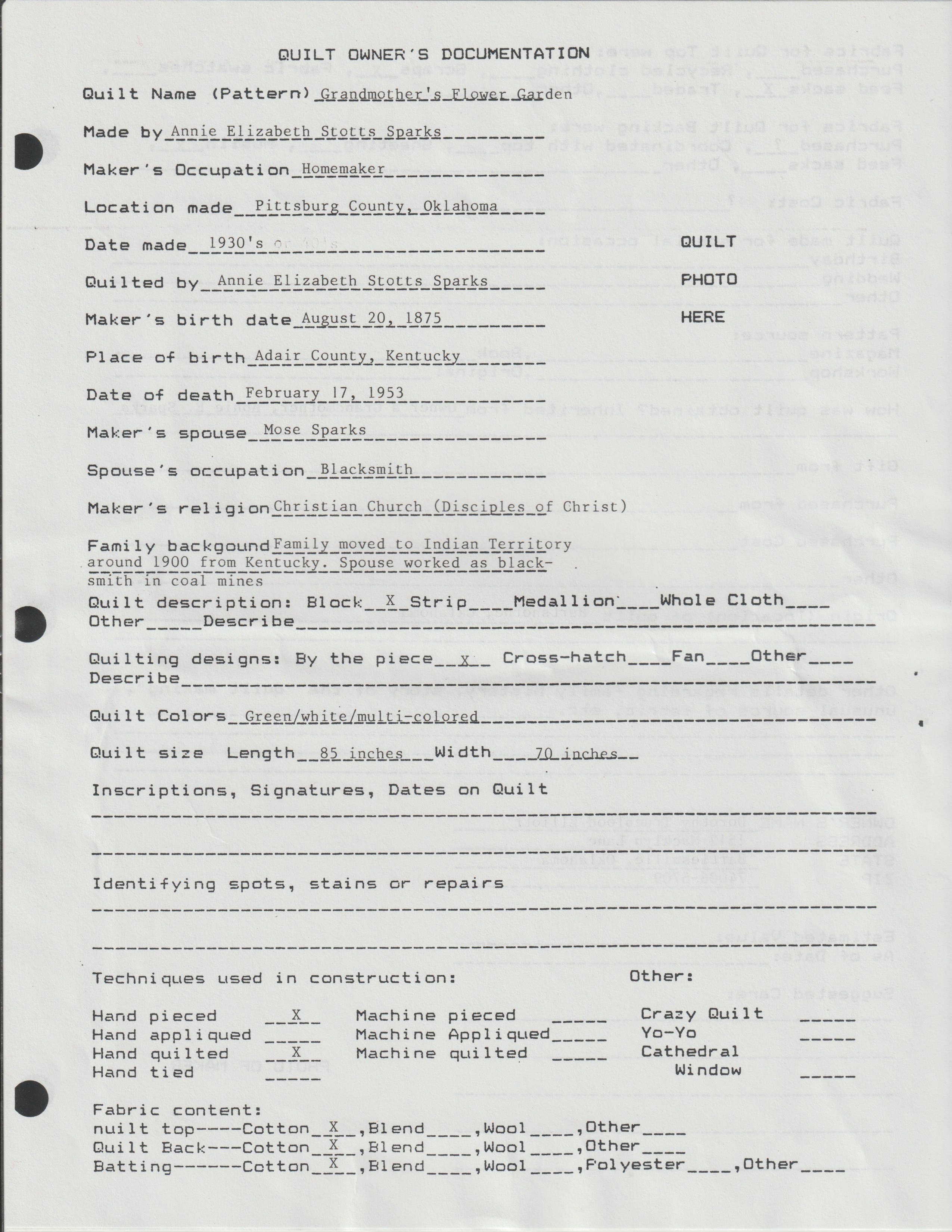 Maker: Annie Elizabeth Stotts Sparks